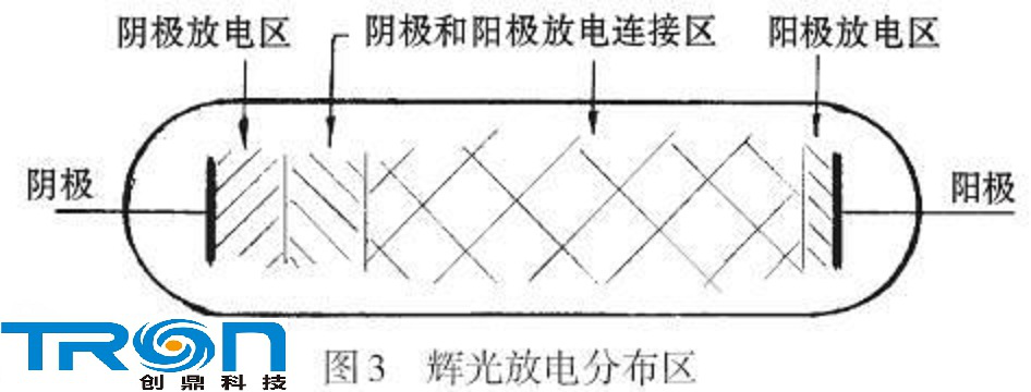 輝光放電有亞正常輝光和反常輝光兩個(gè)過(guò)渡階段,放電的整個(gè)通道由不同亮度的區(qū)間組成,即由陰極表面開(kāi)始,依次為:阿斯通暗區(qū);陰極光層;陰極暗區(qū)(克魯克斯暗區(qū));負(fù)輝光區(qū);